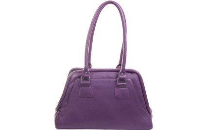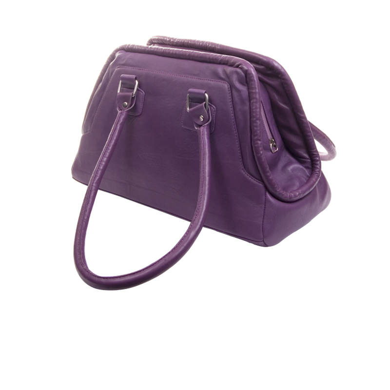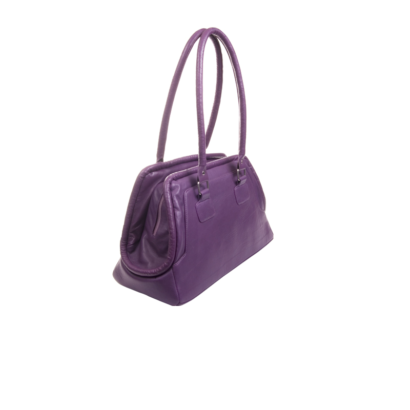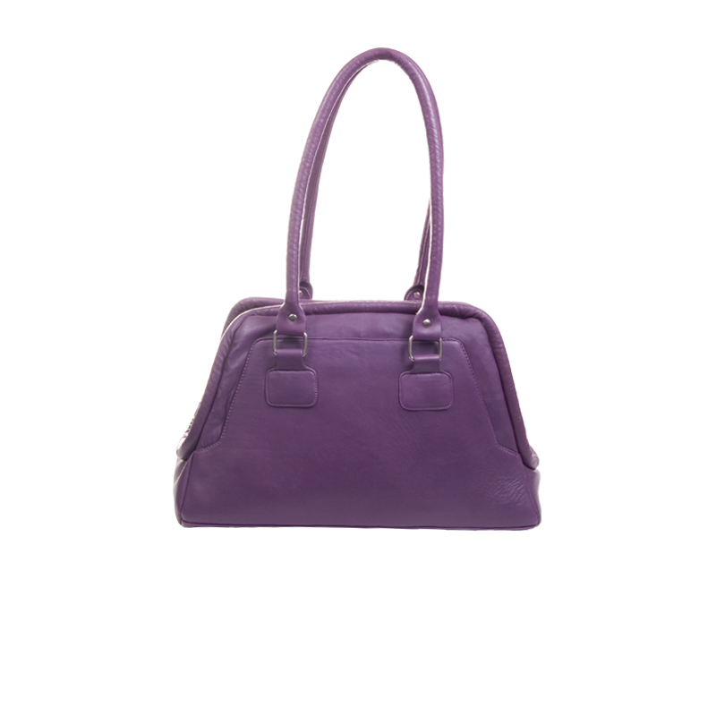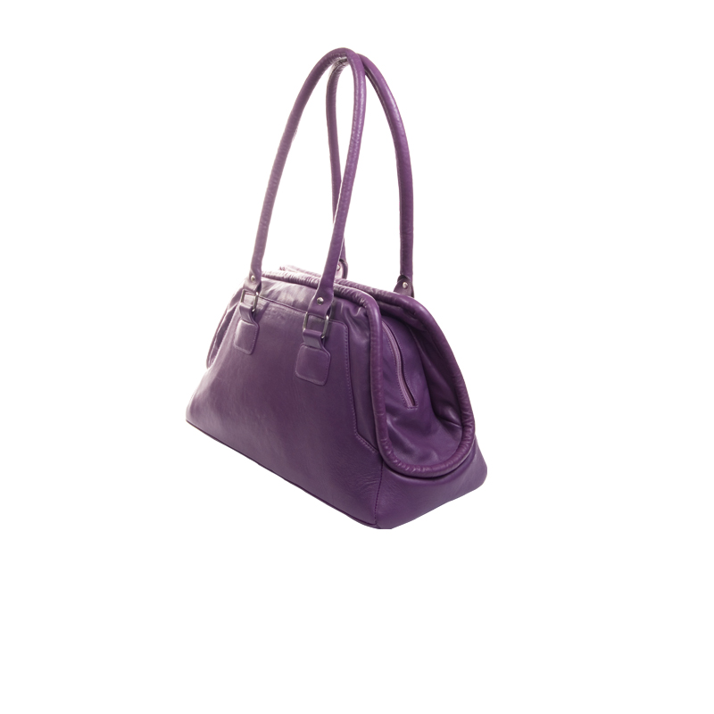 Purple leather shoulder bag with purple suede inner lining. Side-panels and bag opening with raised edge giving the bag a excuisite finish. Multiple interior pockets. Waterproof lining. Nickel feet.