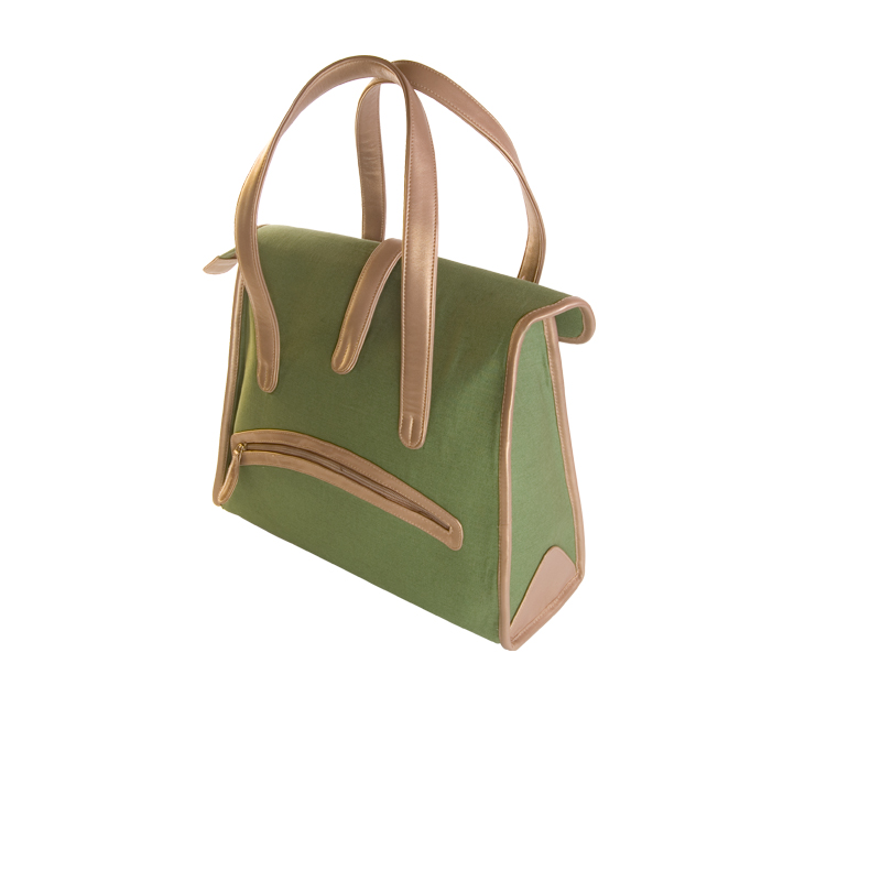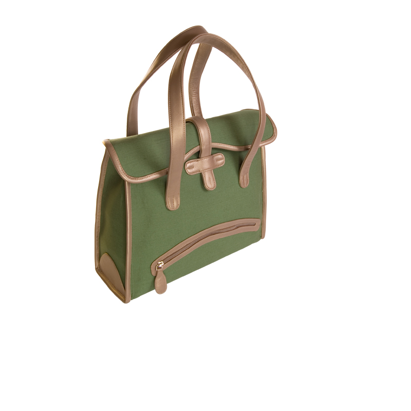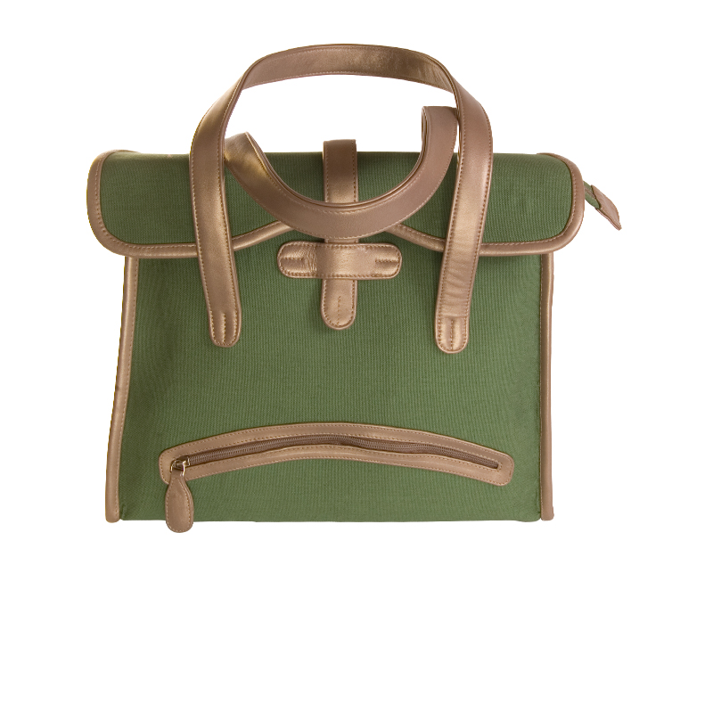 Green canvas bag with titon leather trims and pockets. Golden-brown fabric inner lining, multiple interior and exterior pockets, zip closure.
