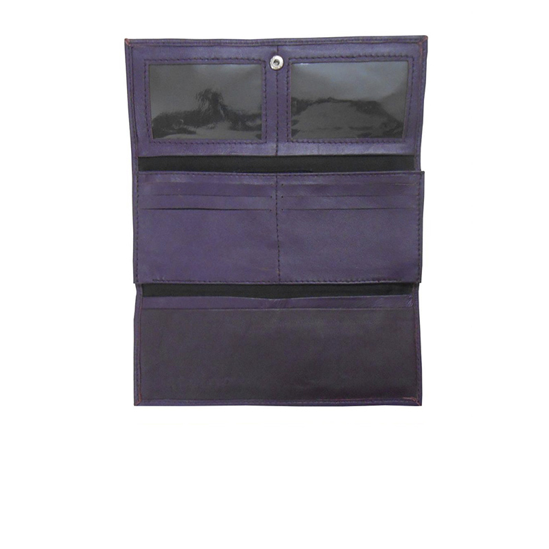 A great companion wallet crafted from Purple leather with black polyester inner lining. Design includes multiple slots to carry everyday essentials. Three fold button closure.