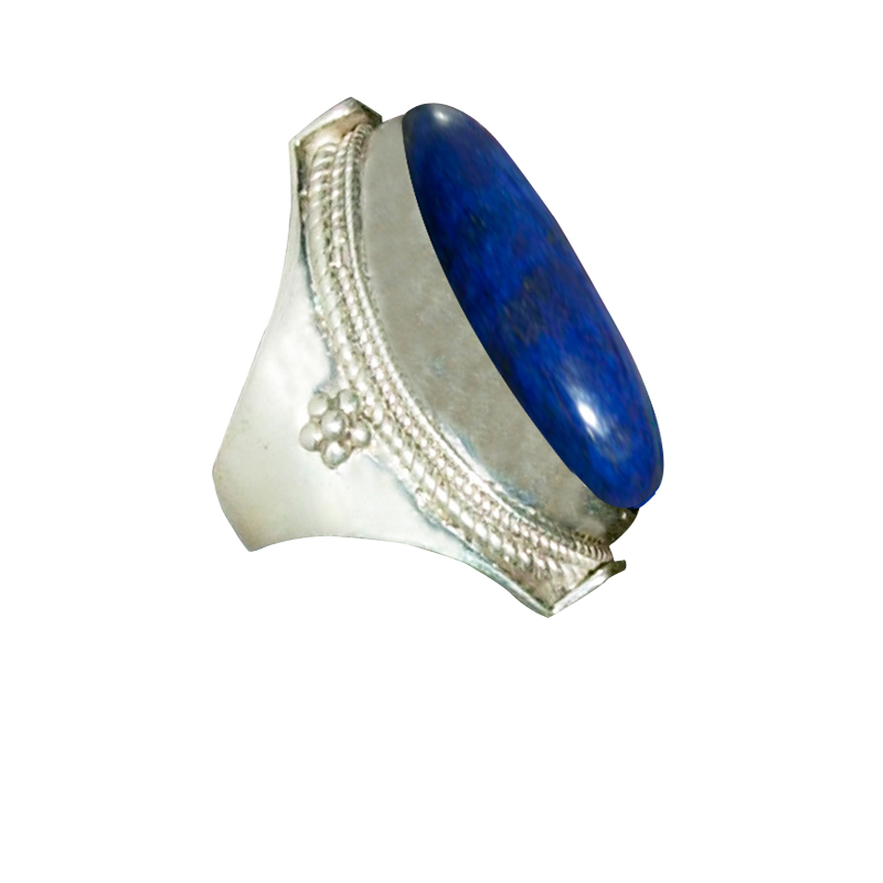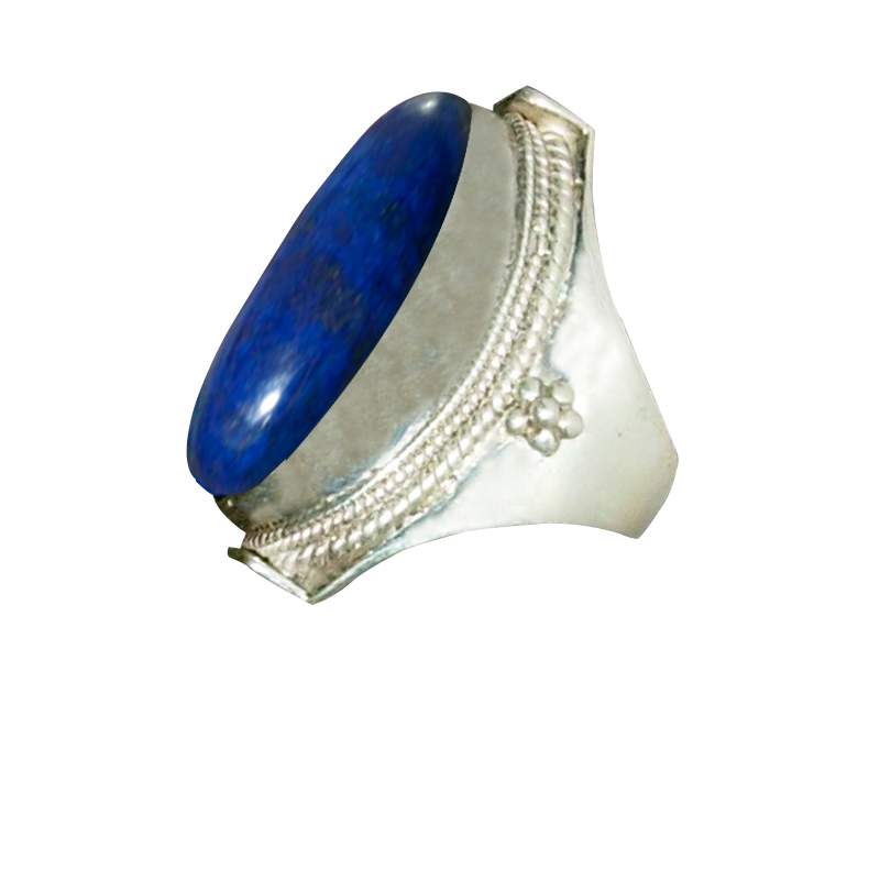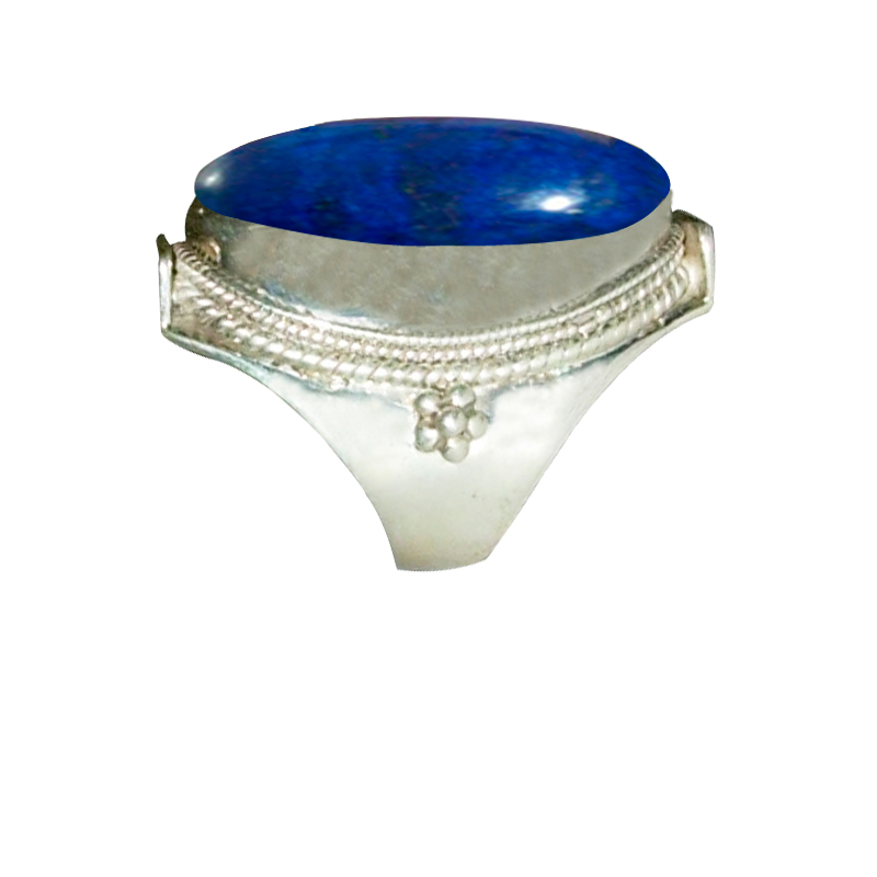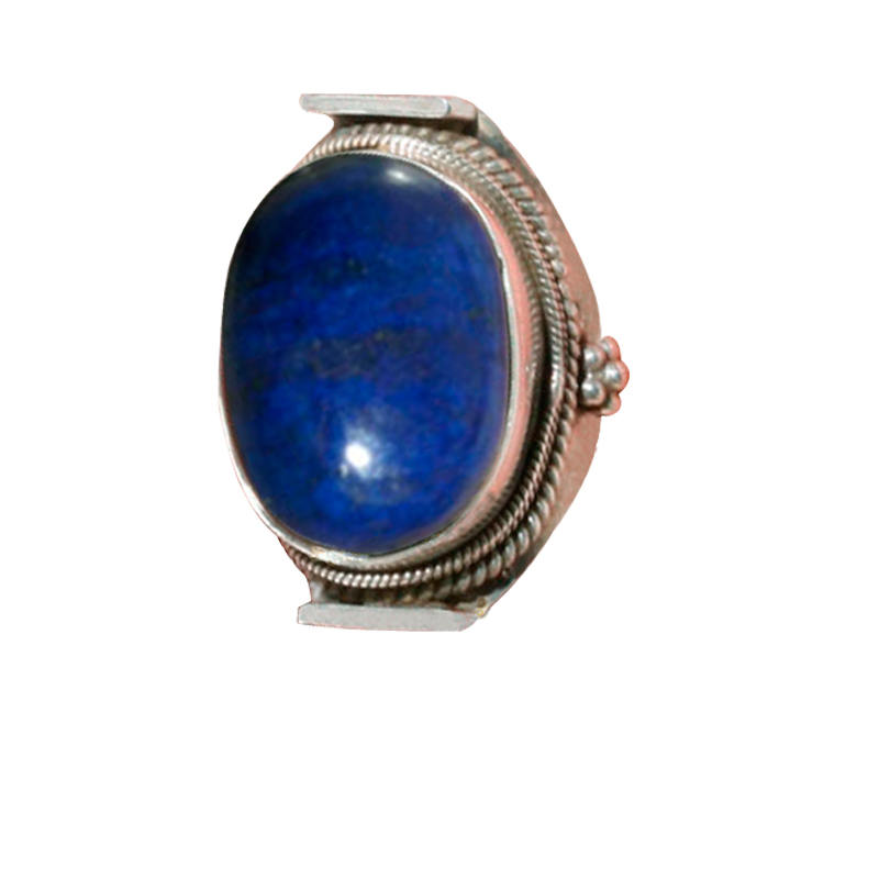 Smooth surface lapis lazule with delicate braiding all around and two beaded florettes flank the band on either side. Available in size 6,7 and 8.