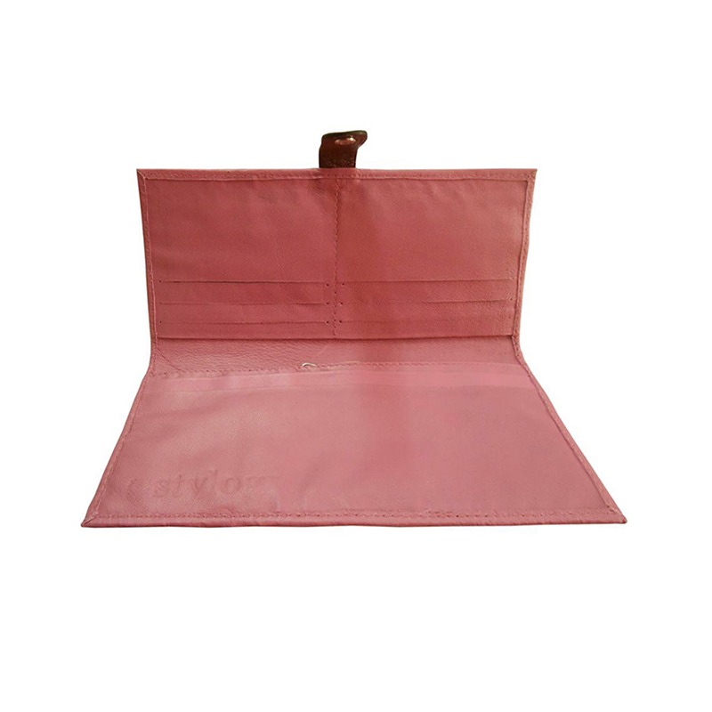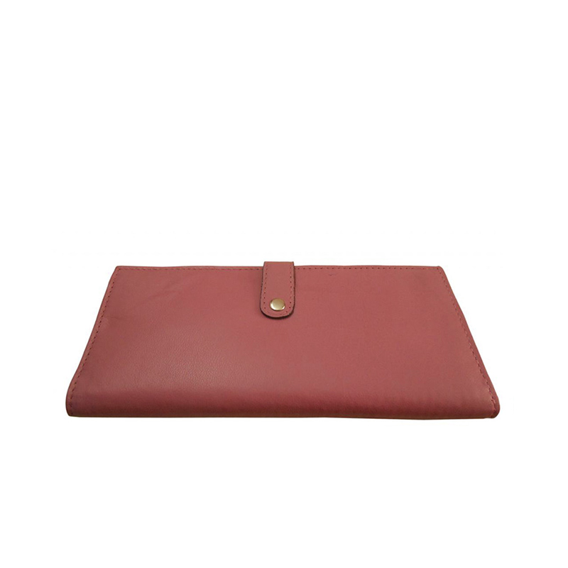 A great companion wallet crafted from pink leather with black polyester inner lining. Design includes multiple slots to carry everyday essentials. Button closure.