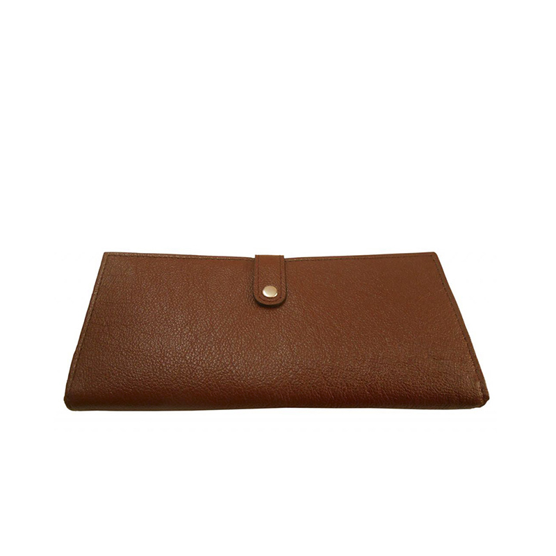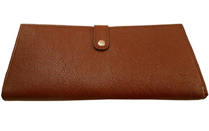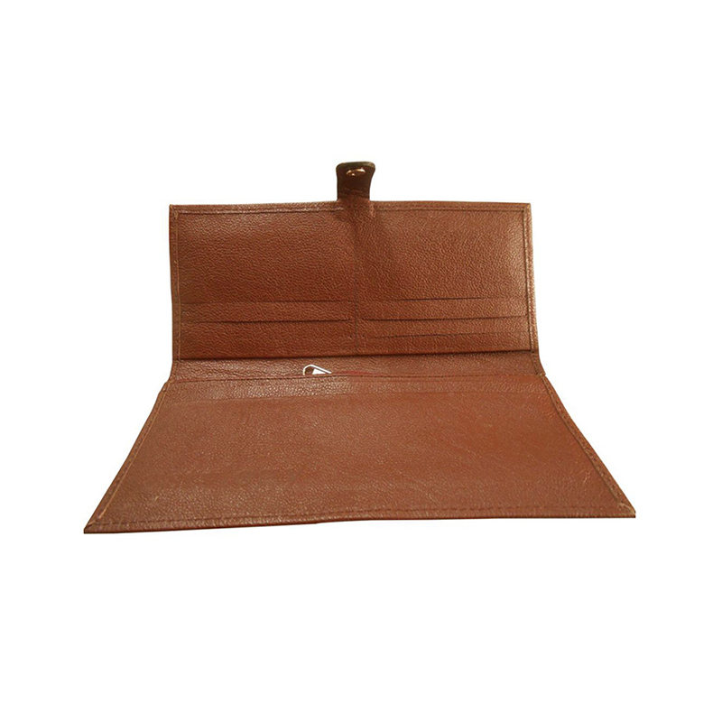 A great companion wallet crafted from brown leather with black polyester inner lining. Design includes multiple slots to carry everyday essentials. Button closure.