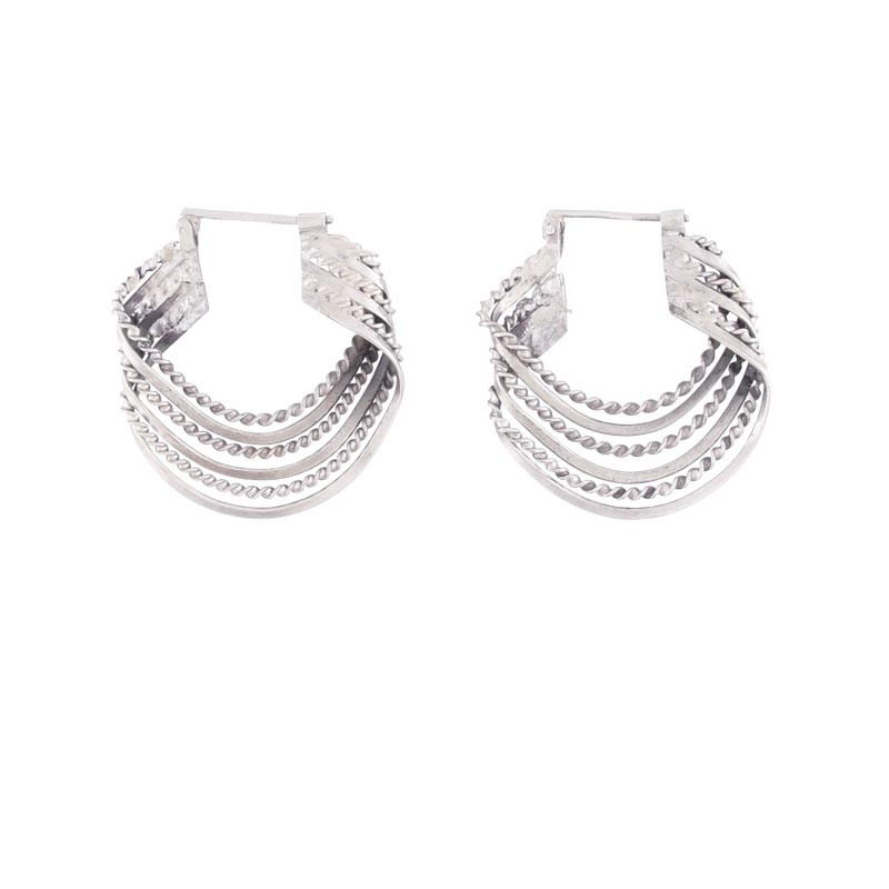 Finely handcrafted five German Silver string banded earring. Hinge closure.