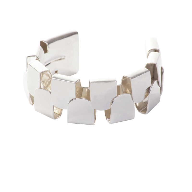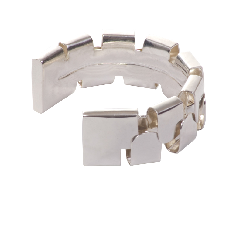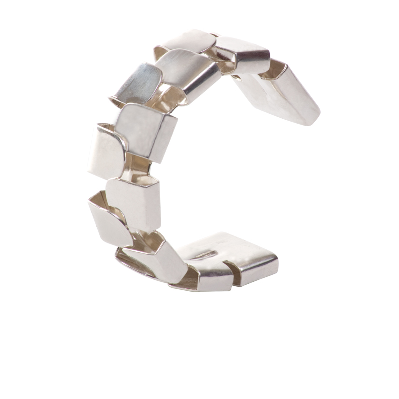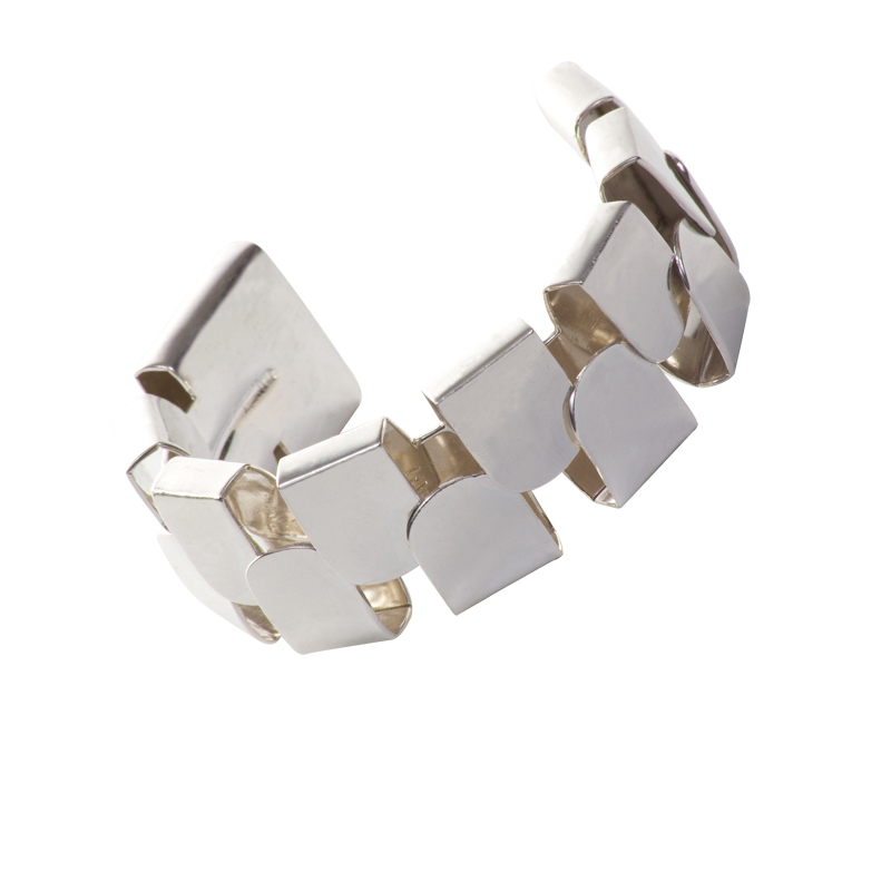 Cuff with overlaid D rings bringing architectural effect. It is light and flexible to allow for size adjustment.