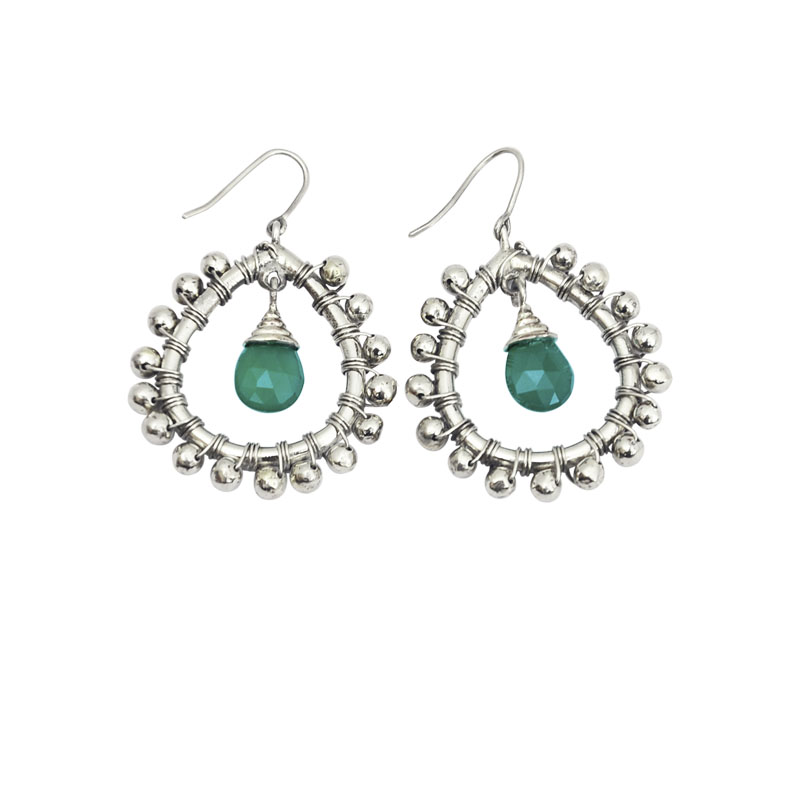 Ornate tear shaped earring decorated with small German Silver orbs with a cut Green Onxy cut stone. Hook closure.