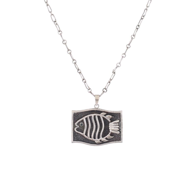 Perfect for nature-lovers. Fish inspired pendant has handcrafted German Silver artwork on a etched German Silver plate.