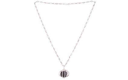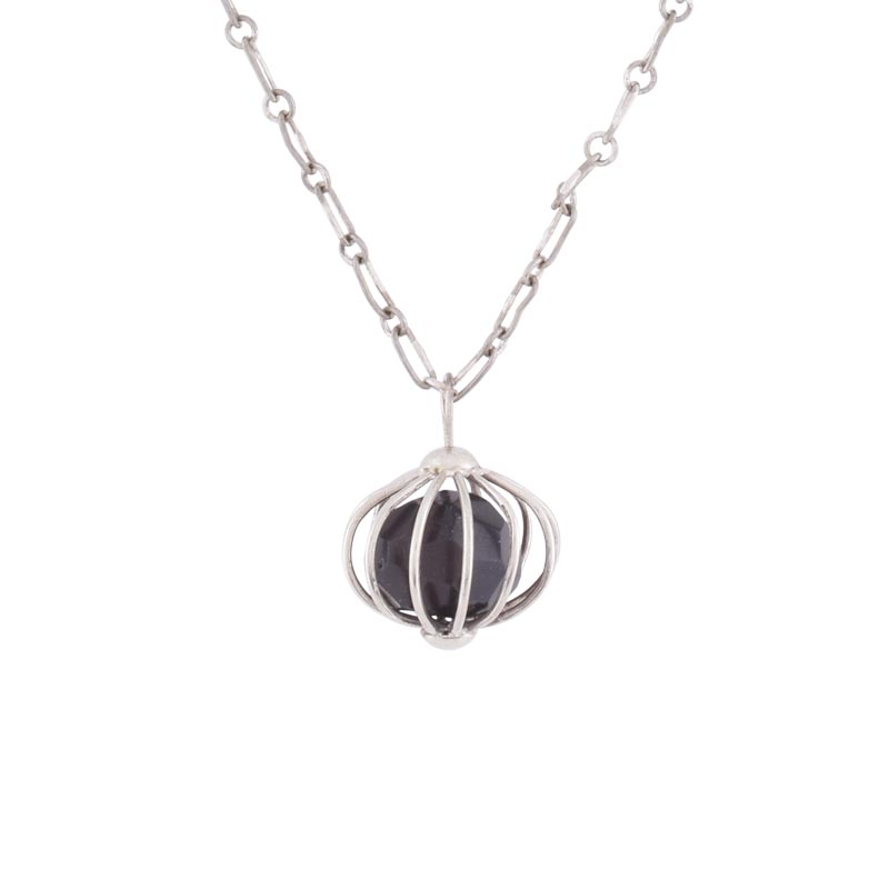 Eye-catching German Silver wire orb pendant holding a 30 carat black garnet stone. German Silver chain included. Hook Clouser.