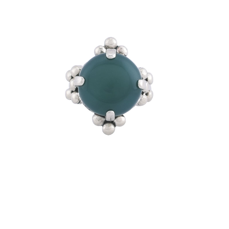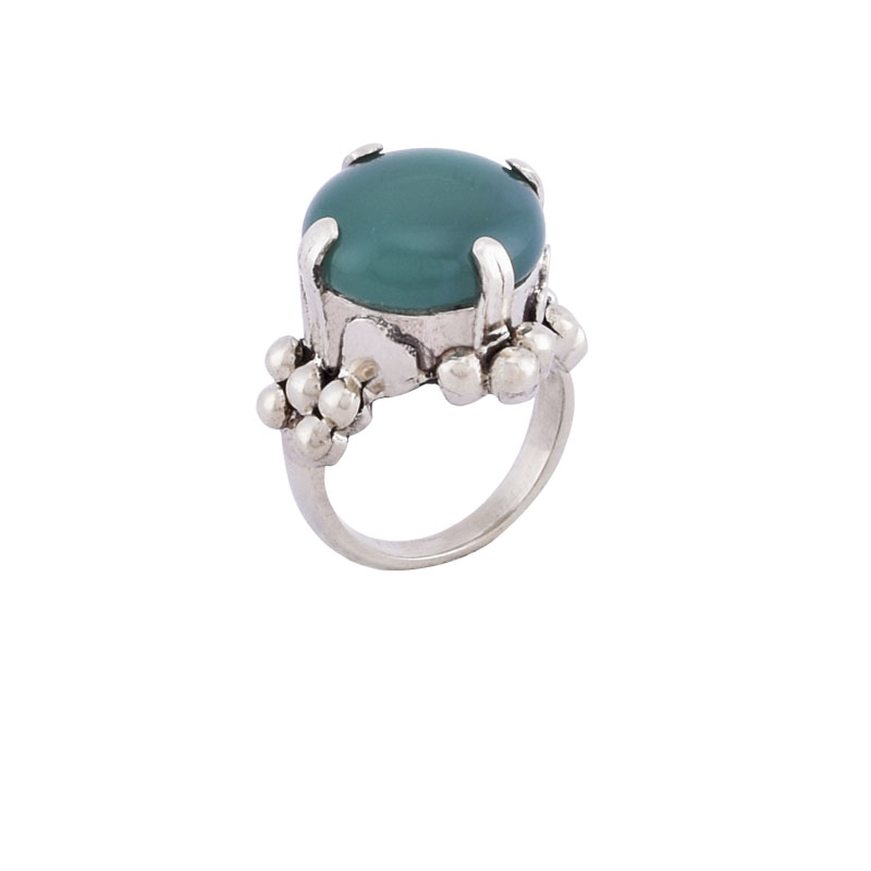German Silver ring with a rounded green onyx stone anchored by four ornate posts. Available in size 6, 7 and 8 .