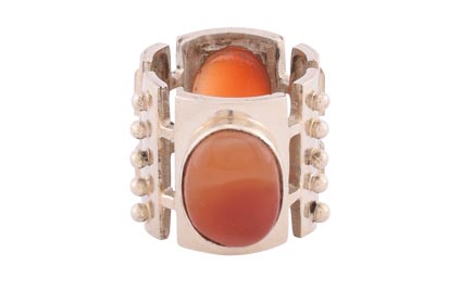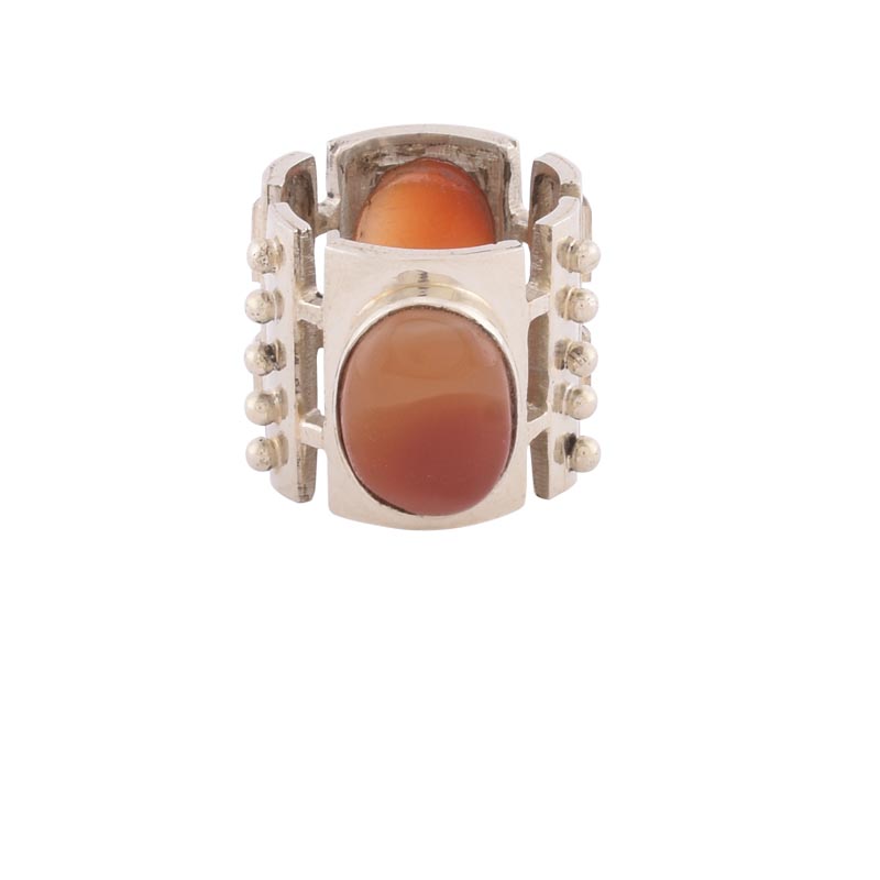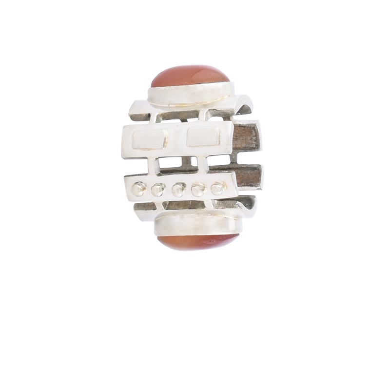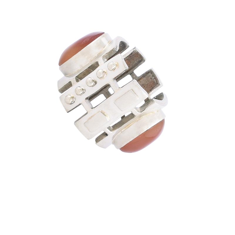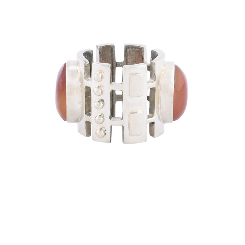 German silver band with dramatic motif around two carnelian stones. Available in size 8.