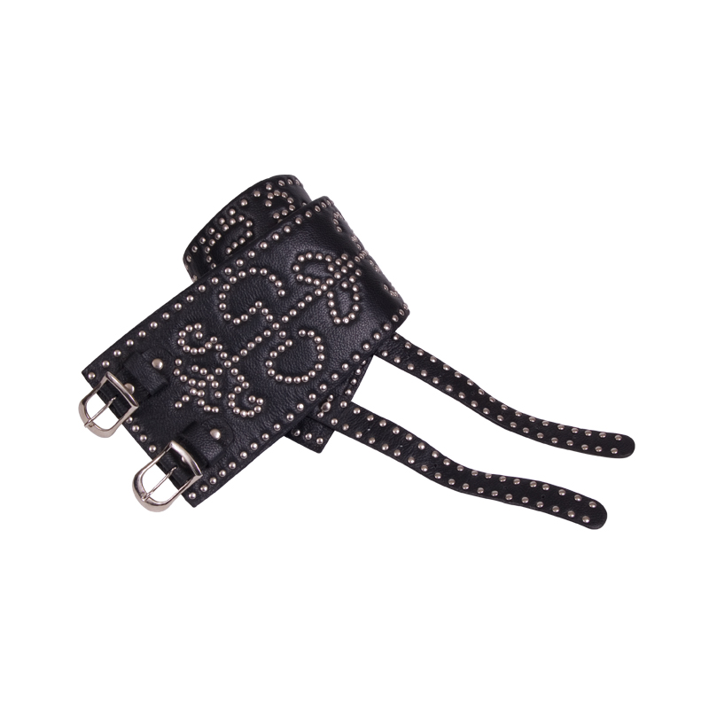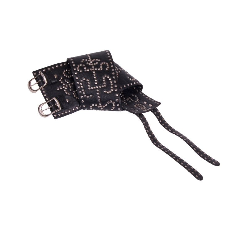 Black leather belt with gaelic design made with nickel rivets. Available in small, medium and large.