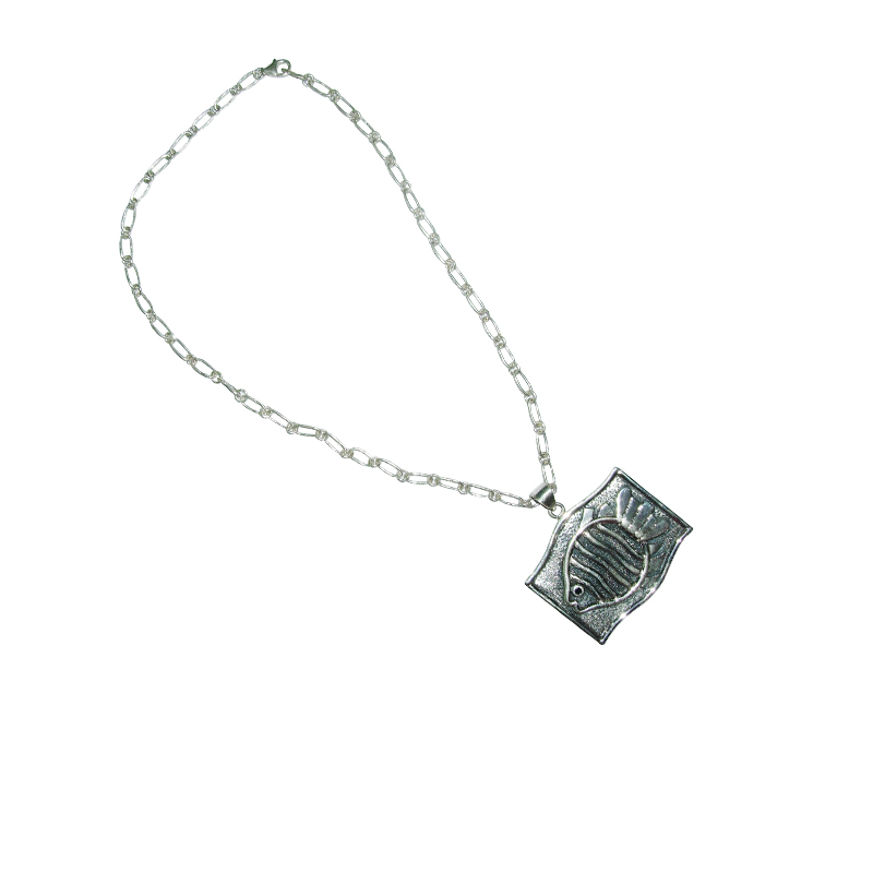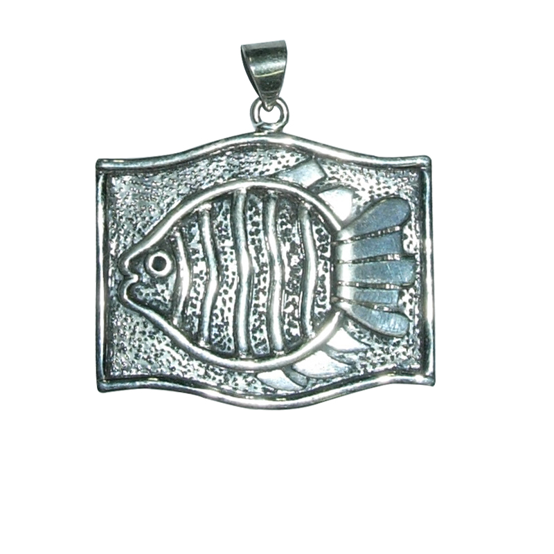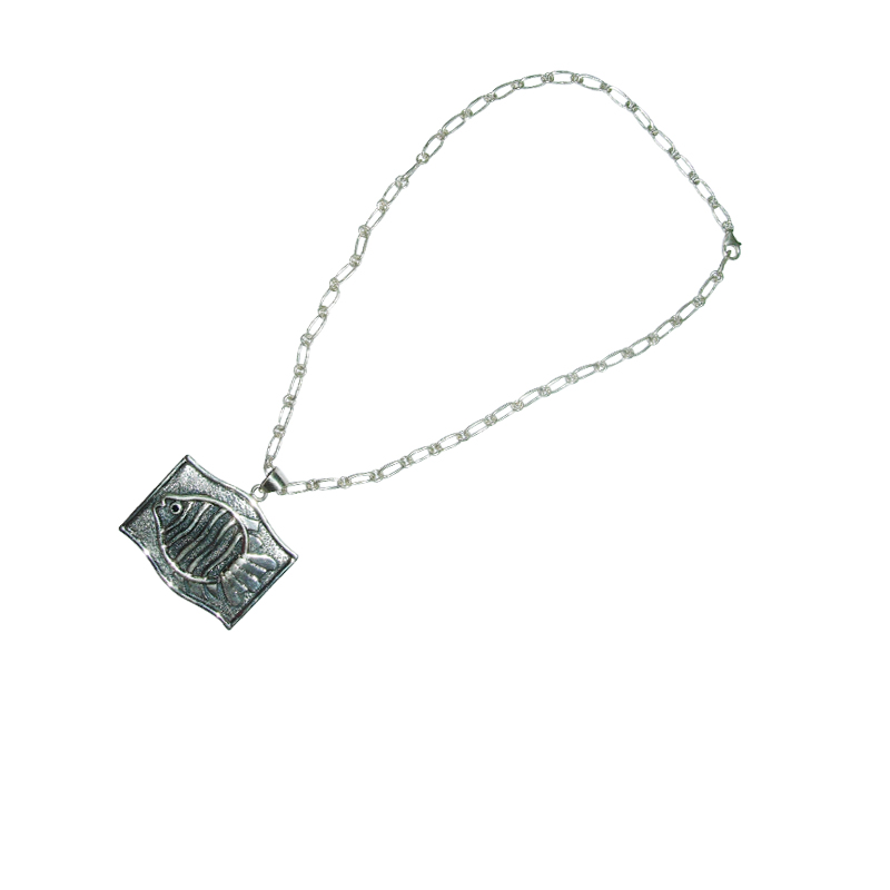 Perfect for nature-lovers. Fish inspired amulet has handcrafted sterling silver artwork on a etched silver plate.