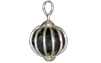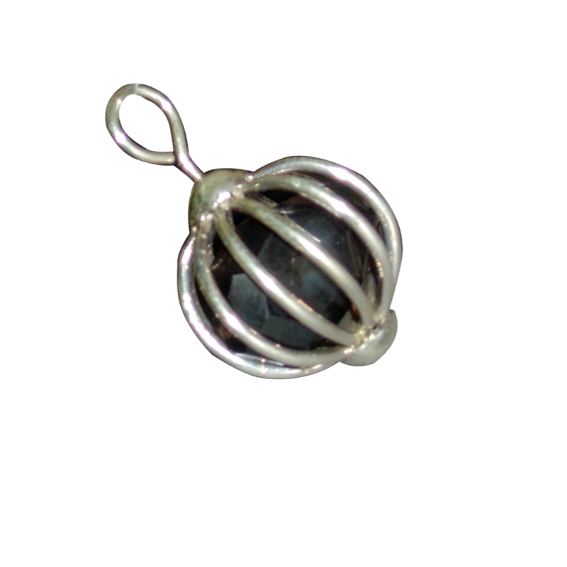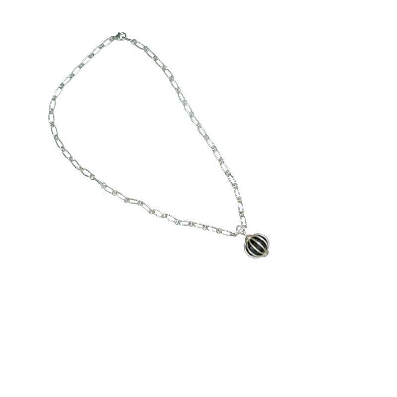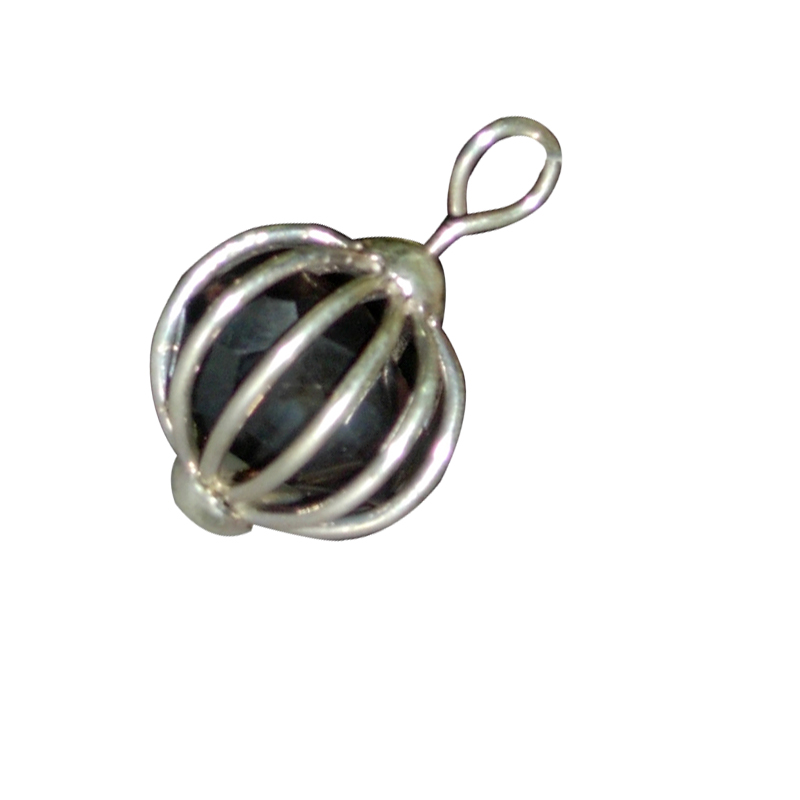 Eye-catching sterling silver wire orb amulet holding a 30 carat black garnet stone. Sterling silver chain included. Crab lock.