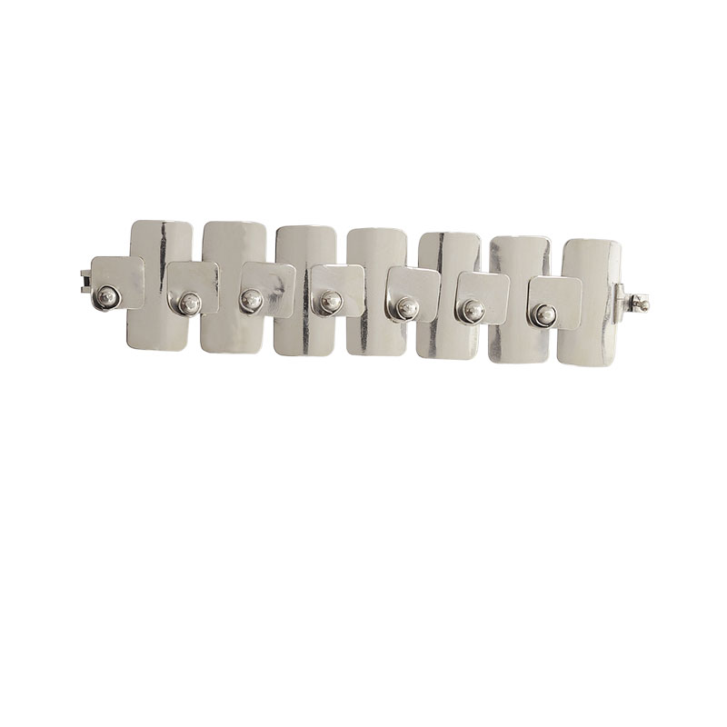 German Silver rectangular panels hinged and topped by a small German Silver coil creating sophisticated and modern aesthetic. Slide bar closure.