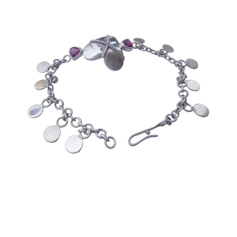 Heart shaped pendant connected to ornate chain with silver circles hanging from the chain. Hook closure.