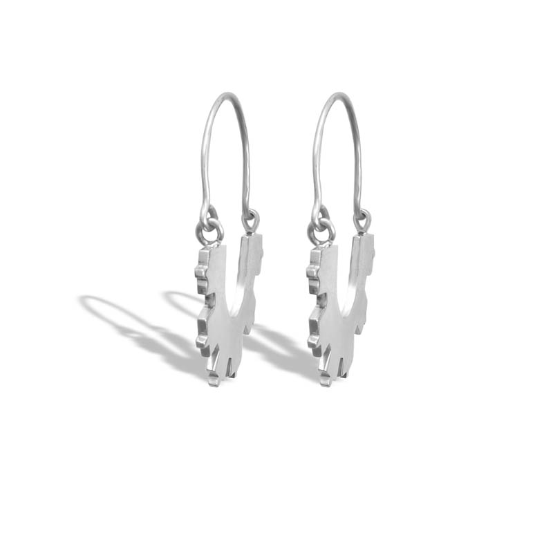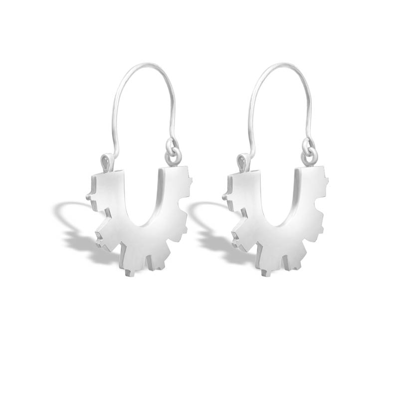 German Silver hoop with handcrafted axle key motif giving this hoop a modern look. Flat back side and saddleback closure.