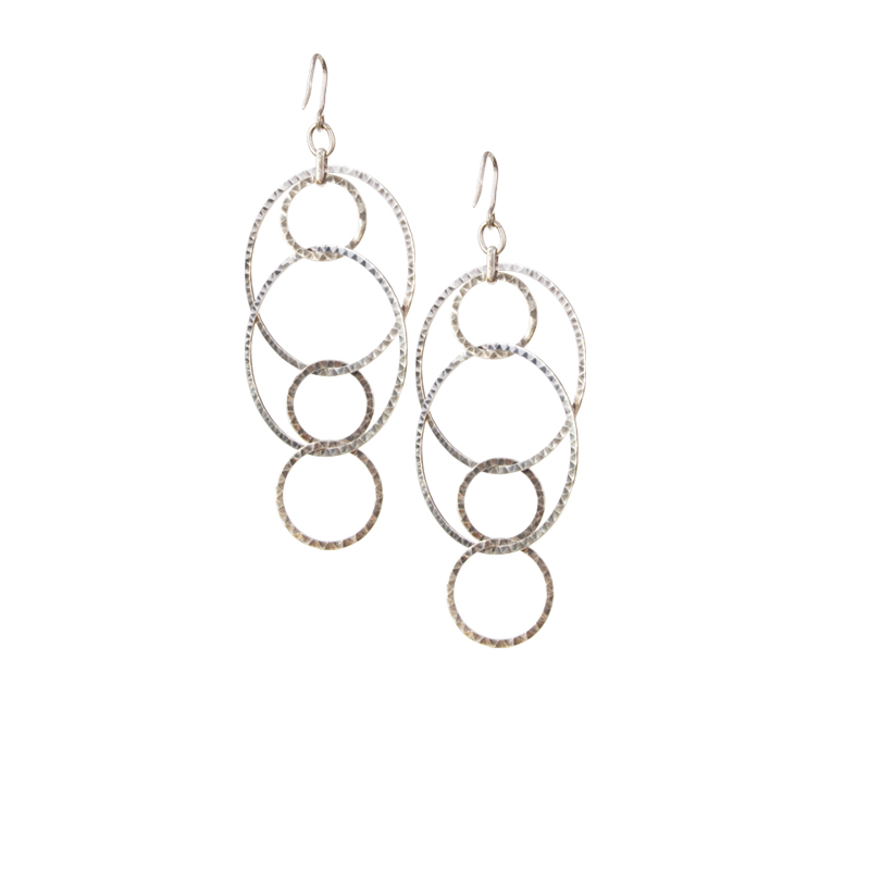 Five interconnected hammered sterling silver rings hanging from a hook closure.