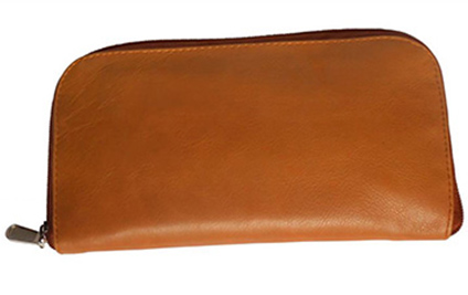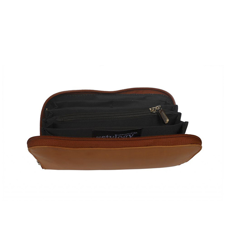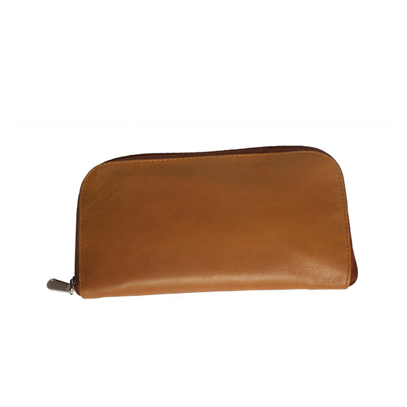 A great companion wallet crafted from light brown leather with black polyester inner lining. Design includes multiple slots to carry everyday essentials. Zipper closure.