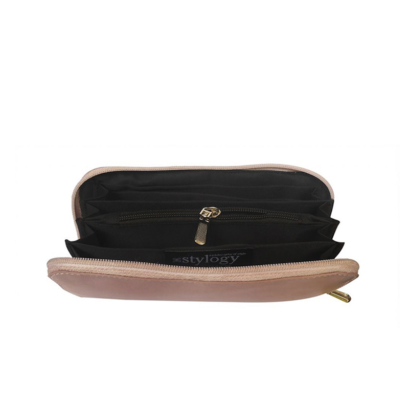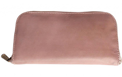 A great companion wallet crafted from Light Pink leather with black polyester inner lining. Design includes multiple slots to carry everyday essentials. Zipper closure.