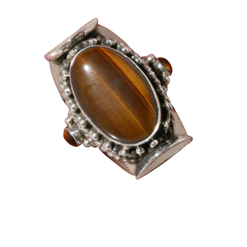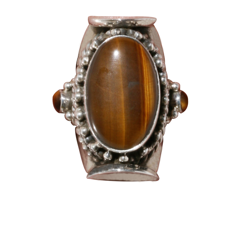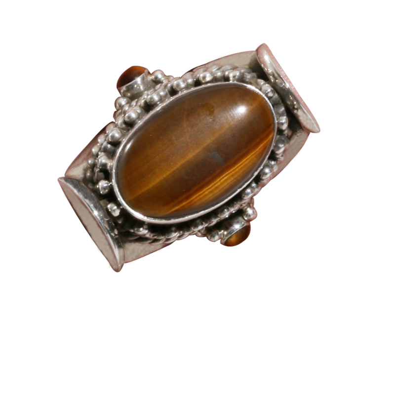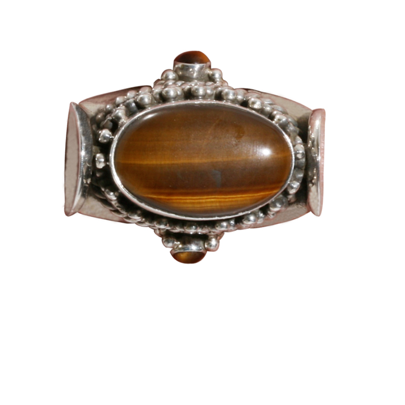 Sterling silver ring with a centerpiece tiger eye stone surrounded by handcrafted ornate design. Available in size 6, 7 and 8.